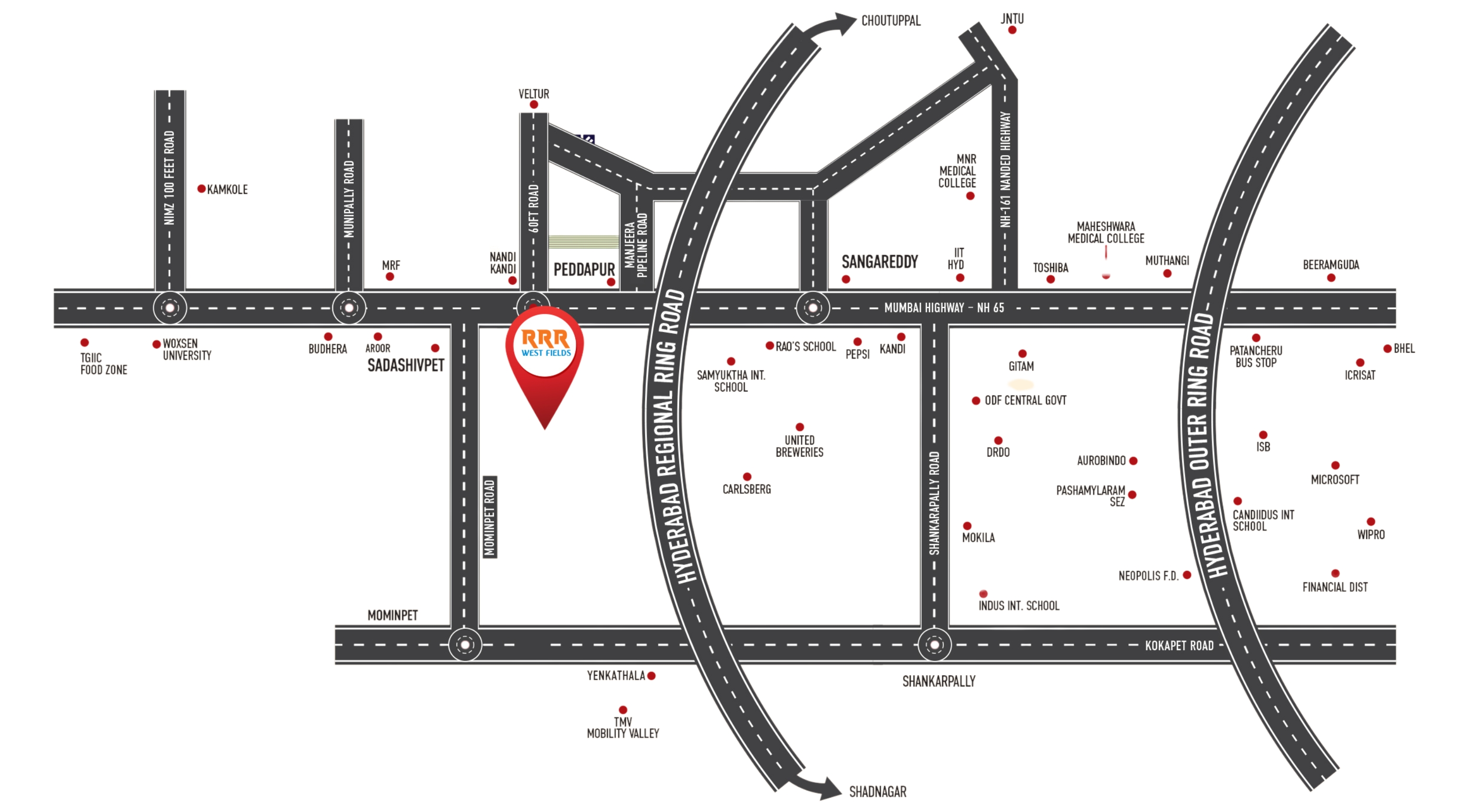 RRRR West Fields is your gateway to elite living in Sangareddy. This exclusive villa plot layout offers DTCP-approved and RERA-certified plots, perfectly positioned near the Mumbai Highway and Regional Ring Road for exceptional connectivity and promising growth potential. With high-end amenities such as a landscaped park, an upscale clubhouse, an elegant atrium, and facilities, this community provides a luxurious lifestyle designed for those who seek the extraordinary. Imagine living in a landmark community where elegance meets convenience. The children's play area and thoughtfully designed spaces elevate your living experience. Secure your place in this thriving, high-growth community today.